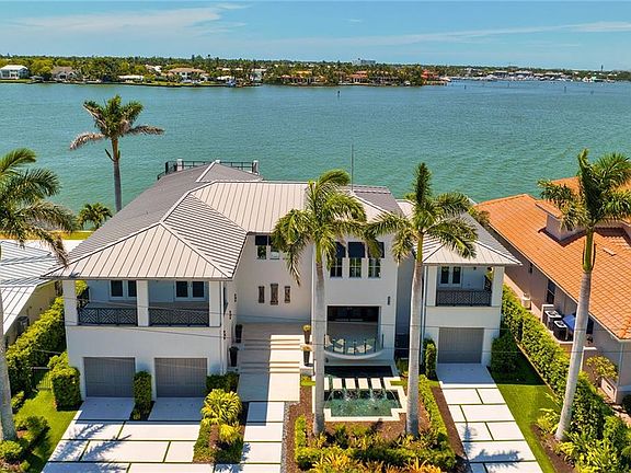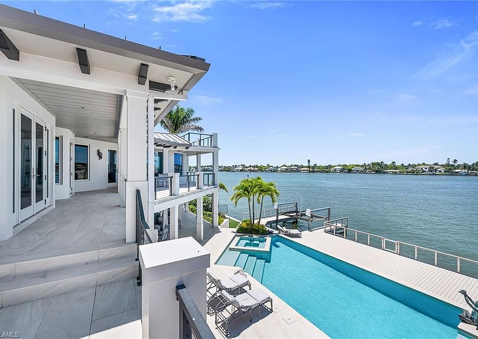 Luxuriously renovated inside and out, this Royal Harbor waterfront home provides an idyllic living experience for those who appreciate the finer things in life. Enjoy rich, sophisticated woodwork and breathtaking back-lit coffer and tray ceilings. With large impact windows strategically placed, stunning views of Naples Bay can be enjoyed from almost every room. Electronic blinds allow the control of natural light and provide privacy at the push of a button. The chef’s kitchen with quartz countertops is equipped with Sub-Zero, Wolf, and Miele appliances and features a fully equipped butler’s pantry to ensure seamless and sophisticated hosting. A custom staircase and elevator provide access to the four ensuite bedrooms, library and office. The owner’s suite with seating area and private balcony offers a serene escape to enjoy the tranquil surroundings. A walk-in steam shower with dual showerheads and spa jets and a separate soaking tub are highlights of the primary bath as well as a massive closet with custom shelving, hanging racks and center island with drawers. The outdoor living space is equally impressive with multiple seating areas and an infinity-edge saltwater pool and spa which is perfect for relaxation and entertainment. Panoramic views and sunsets are enjoyed from the rooftop deck. The private boat dock allows for direct access to the Gulf of Mexico, while the attached lounging deck provides another area to enjoy the water view.