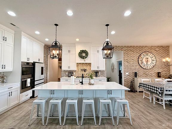 Discover this stunning, modern home featuring an open-concept design in a tranquil neighborhood by a serene pond. The sought-after floor plan includes split bedrooms for enhanced privacy, with a spacious second bedroom that boasts an ensuite, making it ideal for use as an office, gym, or versatile space. The gourmet kitchen is a chef's dream, showcasing charming brick accents, a double oven, Bosch appliances, and ample storage. Enjoy peaceful evenings in the spa while overlooking the expansive backyard, which includes a large covered patio, no rear neighbors, ranch-style fencing, a garden area, and picturesque views of Bogus Basin, adding to the home's many appealing features.