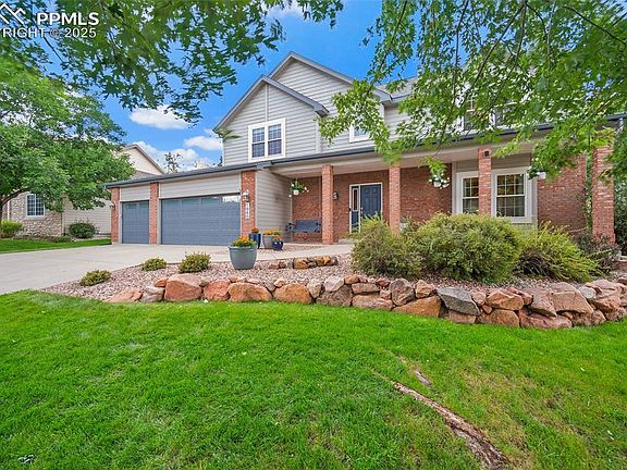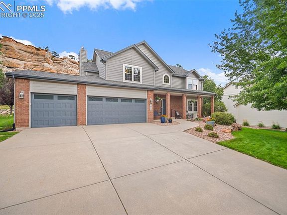 Drama and serenity come together in this meticulously maintained two-story home set against a backdrop of hoodoo rock formations on an exemplary street in the shadow of Blodgett Peak. A peaceful main level seamlessly melds formal spaces with more casual ones for comfortable living, and five bedrooms provide all the space you need for everyone you want to live with or visit you. A cozy family room sits off the kitchen/dining combo with fireplace and built-in bookcases, with a walk-out to a large composite deck complete with retractable awning that sits under towering hoodoos above for dramatic and private outdoor living. Four large upstairs bedrooms are anchored by a massive master suite with renovated bath that gorgeously presents a glass shower enclosure, separate tub, dual vanity and walk-in closet, and adds heated floors for extra comfort. The fully finished basement is so perfect for guests that they may never come upstairs, with a quiet bedroom, game space, kitchenette and a second cozy living space with gas fireplace, as well as a full bath and storage. The three-car garage includes cabinetry for storage and a built-in workbench, and the roof, exterior paint and furnace are all new since 2024. Situated on a neighborly tree-lined street in the lower part of Peregrine, the home is easily accessible to Woodmen Roberts Elementary School, hiking trails, I-25, shopping and restaurants.
