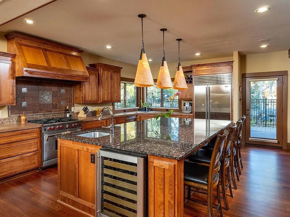 This home sits on a corner lot in the Three Pines community, nestled among the aspens and junipers. Enter the home through a custom, oversized door, and cozy up to the fireplace. Living room opens up to a large, well-appointed chef's kitchen with a massive granite-topped island, custom features, high-end appliances, and wine cooler. Two dining areas adjoin the kitchen for easy entertaining. Outside, find a fully fenced yard with multiple patios surrounded by trees. Upstairs, there are 4 bedrooms, Jr master suite and large master w/ gas fireplace and peekaboo mountain views. Downstairs, find an office with built in shelving and desk, a second office located near the kitchen/dining area, utility room, pantry and access to the 3-car tandem garage. No smoking. Home located in an HOA. Tenant pays all utilities. First month's rent and security deposit required for move in.