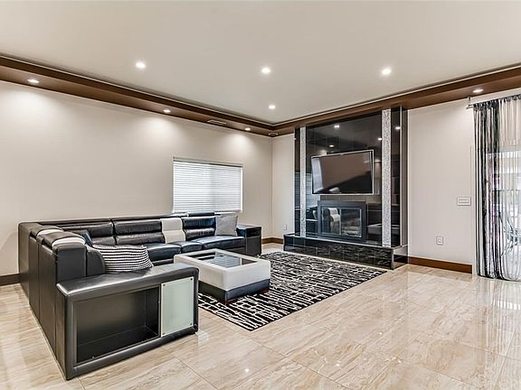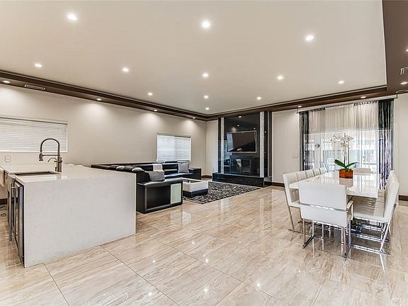 The double door entry leads to a modern open floor plan of living room, dinning room and kitchen with 10ft ceilings and tiled floors. The large living room has a sliding door that directs to a large patio, a pool and a 20ft BBQ island making it perfect for indoor/outdoor entertainment. Both living room and patio are equipped with surround speakers controllable by wall iPad or any hand held device. The tasteful kitchen has a 12ft island with breakfast seating, sleek marble countertops and stainless-steel appliances. The spacious master suite includes a large walk-in closet and a large master bathroom, with a walk-in double shower and separate jacuzzi tub. This home has 2 guest bedrooms, 1 large guest bathroom tiled from floor to ceiling with a walk-in shower. This bright and airy home is packed with pop-out and USB outlets, surround speakers and a camera system. This home is definitely a must see!