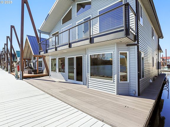 FLOAT WORK IS DONE. FINANCING IS AVAILABLE.Bright and inviting floating house with boat well. The main level of this home features an open plan kitchen, dining, and family room with an unobstructed view, to the east, of the edge of the Columbia River Gorge. The upper-level living room has a a wall of windows that reaches the vaulted ceiling with that same scenic view, a slider to the balcony, and plenty of natural light. The upper level also has a full bath, primary bedroom, second bedroom, and a second balcony that faces west. Completing the main level, are a full bath, third bedroom, and a boat well large enough to accommodate an approximately 24-foot boat. On the south side of the house, there is a dock for a kayak, a dock for a wave runner, and room to keep another wave runner sized craft in the water. This home is located in a very well maintained moorage with gated and paved parking and a boat launch available for residents.