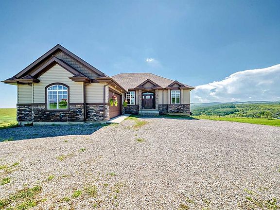 This beautiful 50-acre parcel is perched just outside Calgary’s city limits, offering panoramic views of the downtown skyline and the foothills from pretty much every corner of the land. With over 3200 sqft of developed living space, this 5 bedroom walk-out bungalow (built in 2016) has views that are as stunning from the main floor 600+ sqft deck, as they are from the walk-out lower-levels oversized windows. The heart of the home is the kitchen with rich, espresso-stained cabinetry, sleek granite counters, a massive island for prep or casual dining. The kitchen connects to a bright dining area, living room and large outdoor deck. The main floor has the primary bedroom—attached ensuite as well as two additional bedrooms, additional full bath and laundry room. The lower level is an open plan with 9’ ceilings and an expansive rec room, two additional bedrooms, full bathroom with dual vanities and mechanical room. This property is ideal for an equestrian enthusiast, future development or investment. The gentle sloping land makes it ideal for multiple walk-out sites. Facing the Ann and Sandy Cross Conservation area and located just 2.5 km from Calgary city limits it offers the perfect balance of country living and proximity to city amenities. Red Deer Lake School is just 7 minutes away. With Costco Buffalo Run 12 minutes from your door, but who's counting. With two strong wells (both pumping over 12 gpm), multiple access points including a southeast road allowance, this is a property that balances freedom with function. So if you're looking for space to roam and room to grow—with city life still in reach—this might just be your perfect match.