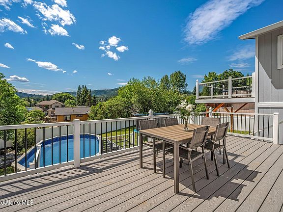 Spokane River views and public river access a block away are the hallmark of this 5BR, 3BA, 2884 square foot home. Step inside to find an 775+ square foot primary ensuite with two walk-in closets, gas fireplace, reading/office area, vaulted ceilings, a private deck to enjoy your morning coffee, plus an ample bathroom with dual vanity & dual head walk-in shower. Enjoy your open concept kitchen/dining and living room with a large open deck with views and access to the above-ground pool. A large family room on the lower level has a cozy gas stove and plenty of room for exercise equipment, gaming area or it's a great spot for large screen movie nights and sports parties. You'll enjoy a lot of sunshine in the south facing large backyard yard with in-ground sprinklers, full landscaping, and an 8x16 storage shed. The heated garage is oversized with shop/tool area to include a sink and 220 outlets. You'll also have a gated, paved RV parking pad with a sewer clean out, Clean out, cable, and water. What a great location for visiting family or friends. Enjoy your own private retreat or grab your kayaks or paddle boards and head to the Spokane River access for a day on the river, this home offers Idaho summer fun in the water every day and water views all year long!