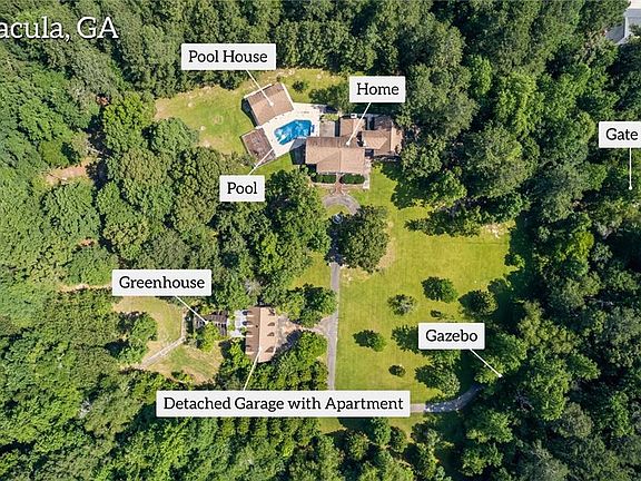 Space and opportunity abound at this unique property, featuring a sprawling 11-acre lot, a three-car garage with attached apartment/office spaces, a main house full of character, and a charming pool cottage. Whether you're dreaming of a family compound, a peaceful retreat, or a one-of-a-kind renovation project, this property is ready to be transformed. The main home offers classic Southern charm with a welcoming front porch, perfect for morning coffee. Inside, you’ll find a large kitchen and dining area ideal for gatherings, a spacious living room with wood-paneled ceilings, built-ins, and a cozy fireplace, plus a main-level library or office. Upstairs, three bedrooms and bathrooms are accompanied by a large bonus room—perfect for a playroom, studio, or guest space. Step outside to enjoy the pool and pool deck, stroll through wooded trails, relax in the gazebo, or listen to the creek as you unwind in nature. While the home does need some TLC, it offers a rare chance to create your dream estate in a serene and private setting. Bring your vision and make this special property your own.