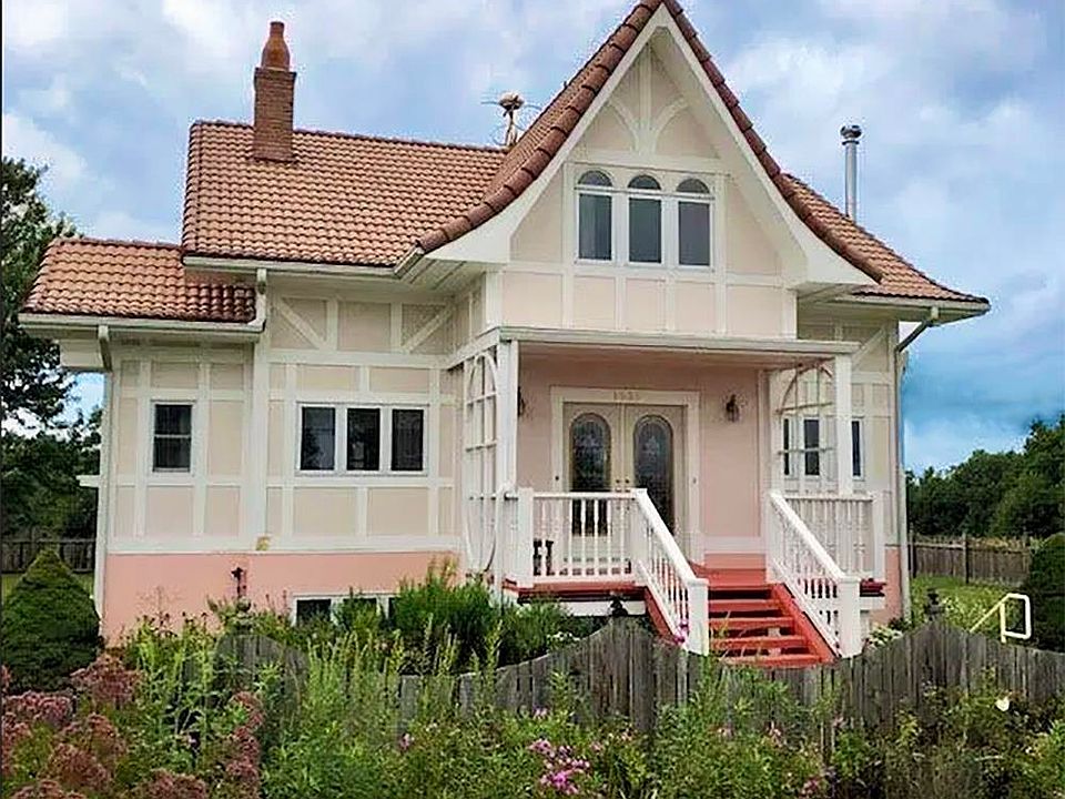 Tudor style homeSolid maple doorsExpansive views of natureAmana windowsSpanish crema mafil marble