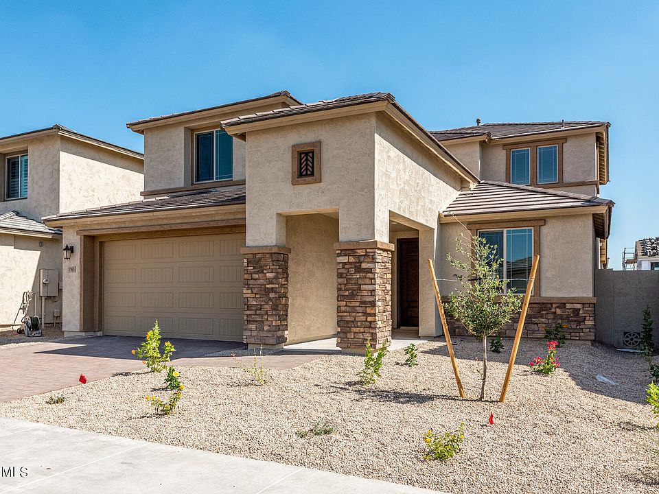 Ready for immediate move in this sought-after Prato two-story residence. The owner's suite is conveniently located on the first floor, accompanied by an additional suite. Revel in the chef's kitchen equipped with a gas cooktop and top-notch appliances, complemented by granite countertops. The upgraded tile and carpet add a touch of luxury, while the center slider in the gathering room enhances outdoor entertaining. An extra bathroom upstairs transforms a space into a suite, and a comprehensive whole house electrical package is included. The front yard boasts a finished desert landscape, contributing to the overall charm of the exquisite interiors.