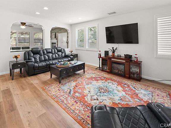 Welcome to this beautifully updated home, 3 bedroom PLUS LOFT/OFFICE could be 4th room, in the sought after St Clare Community where modern comforts meet outdoor tranquility. A charming covered front porch to enjoy the view on this ideal CUL DE SAC location greets you. Boasting an open floor plan with high ceilings and luxury vinyl floors downstairs and engineered hard wood upstairs and tile (NO CARPET), this home is perfect for entertaining and everyday living. The COMPLETELY REMODELED and extended kitchen is a chef's dream, featuring sleek countertops and stylish backsplash, top of the line appliances including wine fridge and custom cabinetry. The family room with its accent shiplap wall has a beautiful and functional built in MEDIA NICHE with tons of storage and gas FIREPLACE. Wood Shutters throughout the home. Downstairs is a FULL bathroom that has been updated to a STUNNING functional masterpiece Step outside to the expansive backyard with a large covered patio area and a separate sitting/fountain area, ideal for entertaining, lots of grass for dogs/kids/gardening or simply unwinding in a private oasis. Modern outdoor lighting features to fit whatever the mood is and highlight the mature trees. No homes directly behind and large paved side yard with storage shed easily converted to perfect garden shed. Upstairs the spacious primary suite boasts an ensuite bath with gorgeous granite counters, dual sinks, jetted tub, separate shower and a large walk-in closet. Two additional bedrooms are connected by a Jack and Jill bathroom, offering convenience and privacy. The upstairs loft/flex room features custom-built cabinetry, bookshelves, and desk top. Upstairs laundry room with built in cabinets and counter. The epoxy floored garage has an additional tandem space that was an optional 4th bedroom offering tons of storage and function. Sustainability meets style with solar panels that keep energy costs low plus a newly installed electric car charger and 4 year old state of the art HVAC system. NO MELLO ROOS and LOW HOA. This community boast a large private COMMUNITY POOL,SPA, PARK and Sports court for St Clare residents and you are just minutes from Popular shops and restaurants and convenient location to both the 5 and 14 fwy access. Sellers spent OVER 100k in NEW UPGRADES in the past 6 Months!!
