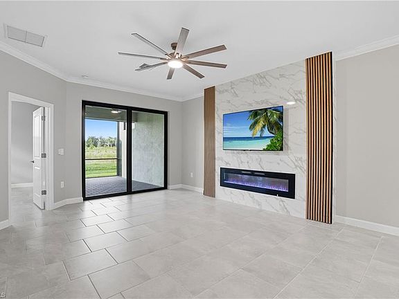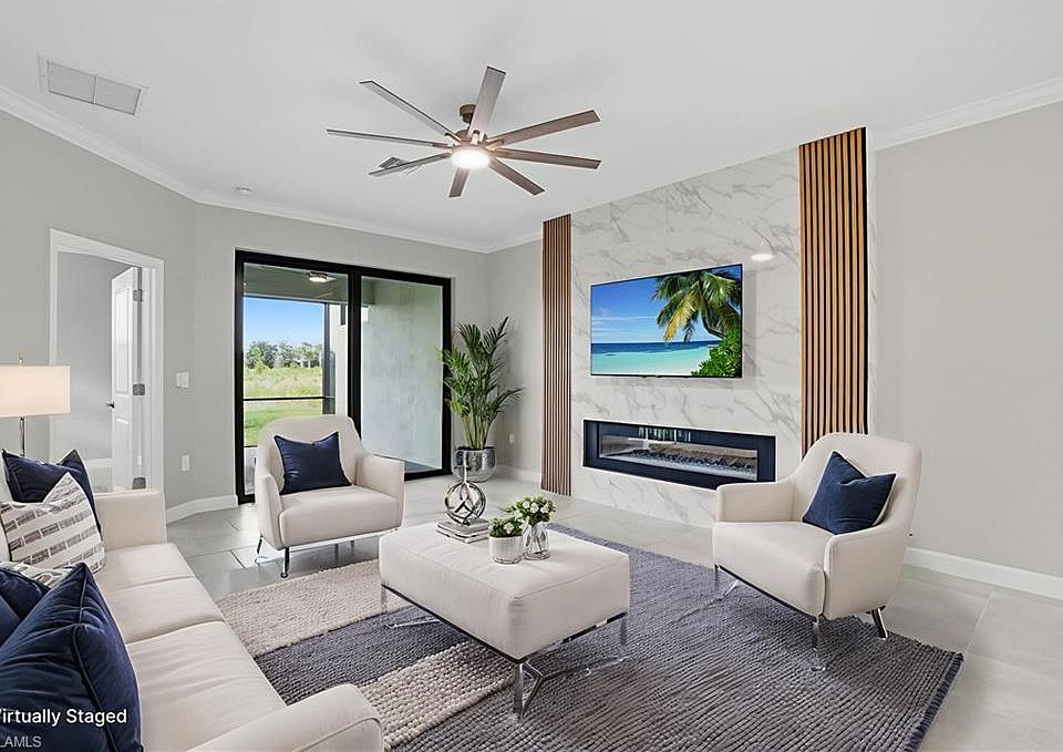 Brand New Upgraded Orchid Villa in Verdana Village – Never Lived In! Welcome to 19612 Hinkley Dr, a stunning brand new, never lived-in Orchid twin villa model located in the highly sought-after Verdana Village. This beautifully upgraded 2-bedroom plus den, 2-bathroom home with a spacious 2-car garage showcases premium finishes throughout and is move-in ready. Step inside to discover designer fans and lighting fixtures, crown molding, and a striking built-in marble feature wall complete with a fireplace and TV, creating a luxurious and inviting living space. The kitchen is outfitted with quartz countertops, a matching quartz stone backsplash, under-cabinet lighting, with white cabinetry. The adjacent laundry room includes built-in cabinets for added convenience and functionality. Both bathrooms offer a spa-like experience with frameless glass shower doors, while the extended lanai provides the perfect setting for relaxing or entertaining outdoors. The north-facing rear exposure allows for comfortable light throughout the day. The epoxy-coated garage floor adds durability and a polished finish to the two-car garage. This home is located in a no-flood zone and offers access to Verdana Village’s impressive resort-style amenities, including 18 indoor/outdoor pickleball courts, 8 indoor/outdoor tennis courts, a state-of-the-art fitness center, a resort-style pool with outdoor bar, Drift Restaurant & Craft Lounge, indoor sports facilities, a kids’ playground, and a dog park. Residents also enjoy golf cart access to on-site retail including Publix, Dunkin’, UPS Store, Fifth Third Bank, and more. Conveniently located near shopping, dining, beaches, and RSW Airport, this move-in ready home is a rare opportunity to own a fully upgraded property with premium finishes and tranquil preserve views.