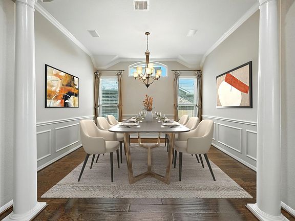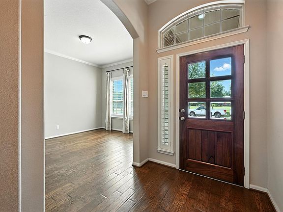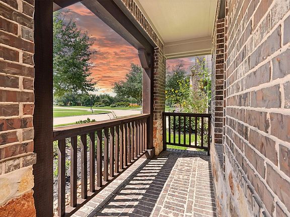 This beautifully maintained 1-story former model home offers 4 bedrooms, 3.5 baths, a private office, media room, and formal dining. Elegant brick-and-stone curb appeal welcomes you inside to hardwood floors, plantation shutters, and an open kitchen with dual islands, granite countertops, and GE Profile appliances. Highlights include a floor-to-ceiling stone fireplace, custom wine room, whole-house audio, and a luxurious primary suite with spa-like bath and walk-in closet. Enjoy lush landscaping, a covered patio, and a full outdoor kitchen with a new Blaze grill ideal for entertaining. The oversized garage features built-in cabinets and epoxy flooring. No front neighbors! Enjoy access to parks, splash pad, and a 300-acre private lake with boat taxi to the boardwalk. Located in Towne Lake with resort-style amenities: waterpark, fitness center, marinas, trails & more. Never flooded. A rare find that won't last!