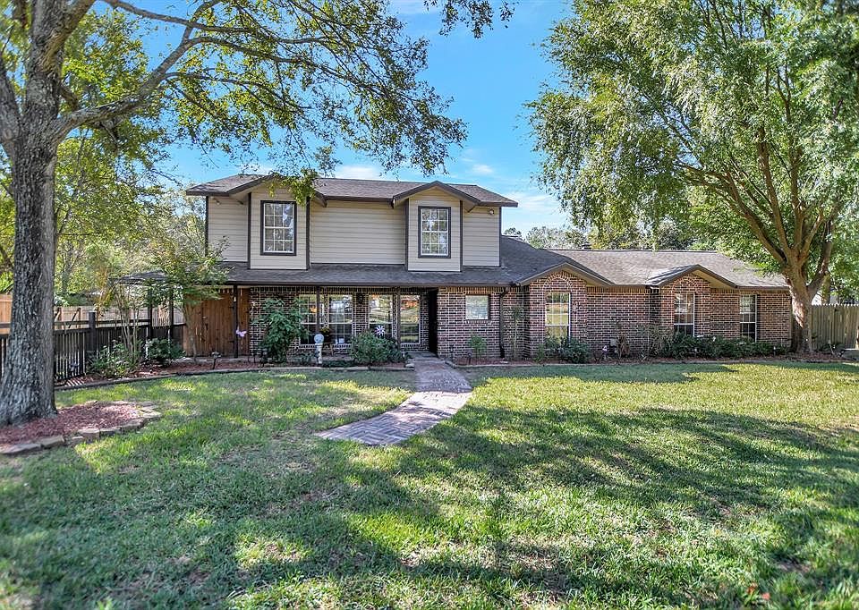 Two-story home on approx 1.24+/- acre lot, fenced & cross-fenced. Unrestricted. Huge living area w/stained concrete floors. Wood-encased windows w/rosette trim. Open Kitchen, dining area. Updated cabinets, appliances and granite. The oversized island/breakfast bar and cook top are a nice touch for entertaining. Tons of extra counter space. One bedroom down has access to full bath and cedar-lined closet. This would also make a great office. Primary bedroom plus 2 secondary bedrooms up. Balcony overlooks pool and landscaped oasis. Spacious secondary bedrooms have cedar-lined window seats. 2 tiered covered deck w/view to in-ground 12\' deep pool w/dive board. Garage is 24x24 w/workbench and 6x8 dog kennel area. 12x24 insulated building w/electric & plumbed. Could easily be made into a \"guest house\". Also 12x20 storage shed with workbench, peg board and cabinets. Lots of wrap-around porches, covered decks! Low tax rate, ez access to 249, 2920, 99. No HOA fees - No HOA!
