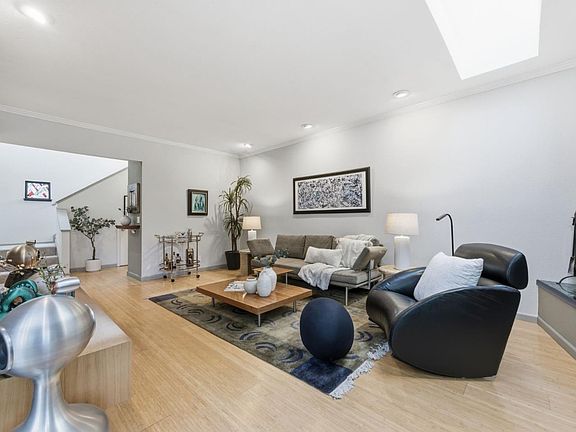 Designed by renowned local architect Sam Sinnott, this contemporary two-level single-family home blends modern style with everyday comfort in a sought-after Menlo Park neighborhood. Freshly painted throughout, it features engineered wood flooring on the main level, new carpet upstairs, and a light-filled open layout with soaring ceilings and floor-to-ceiling windows that connect seamlessly to the outdoors. The updated kitchen offers sleek stainless steel appliances and opens to a bright dining area and spacious living room. The entry door with a large glass panel leads to a private backyard shaded by mature trees, perfect for morning coffee, outdoor dining, or quiet relaxation. Upstairs are three bedrooms and two full baths, including a serene primary suite with a recessed ceiling and an en-suite bath. A full-size washer and dryer are conveniently located upstairs, and the home includes an attached two-car garage. One of only three residences in the community, it shares just one wall and offers the feel of a standalone home with low HOA dues of $48 per month. Ideally located near local cafe shops, Meta (Facebook), and Highway 101, within the award-winning Menlo Park School District.