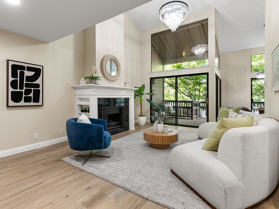 The home boasts a high-ceiling living room with abundant natural light and floor-to-ceiling windows, creating an open, airy feel throughout the space.