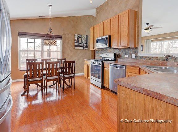 *Buyers financing fell thru* Rarely available 2ND FLOOR Ranch town home. Two story foyer with large closet leads to open and spacious floor plan designed for entertaining. Gourmet sized kitchen with ample cabinet and counter space, Stainless appliances, pantry and breakfast nook. Living room with fireplace, Dining room has balcony overlooking green space. Master suite with vaulted ceilings, walk-in closet, and private bathroom with double sinks, separate shower and bathtub. Generous sized bedrooms. Main floor laundry. Great location near expressways, dining and shopping. Plainfield North H.S. LIVE & ENJOY!