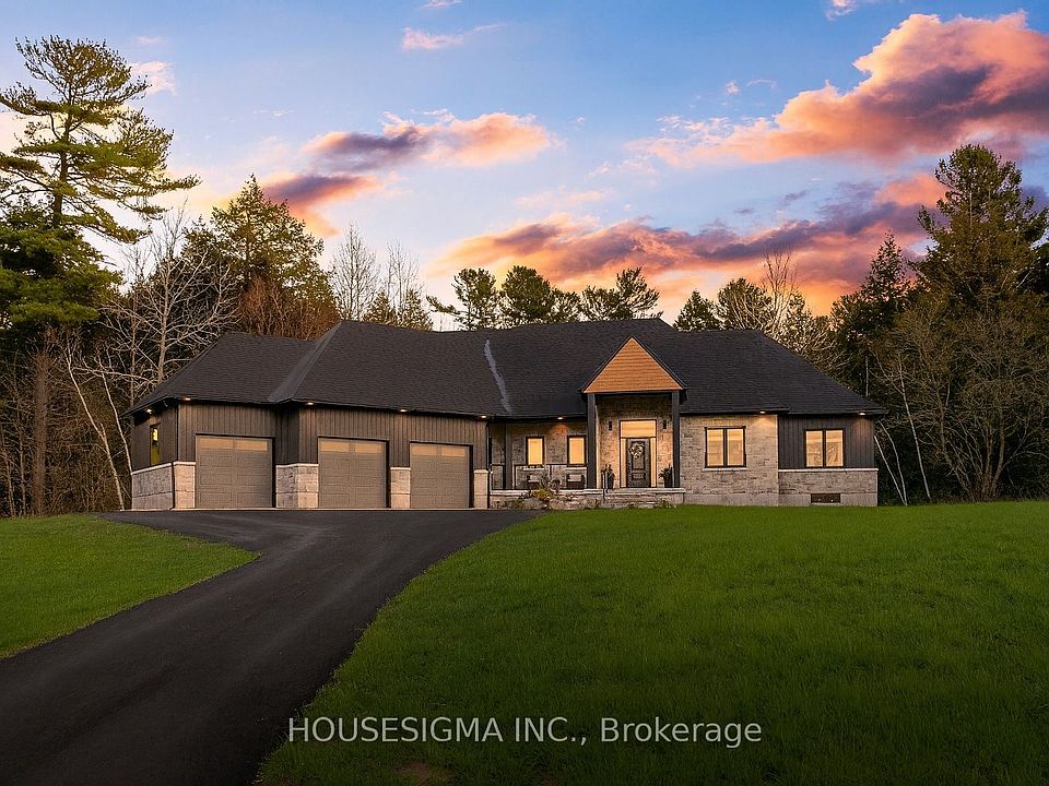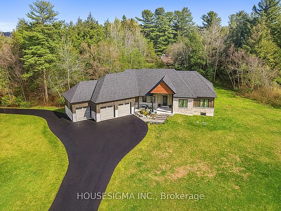 Welcome to this stunning custom-built bungalow, perfectly situated on a sprawling lot just under 2 acres. The striking stonework of the exterior sets a refined tone for this elegant home, showcasing its timeless design and exceptional craftsmanship.Inside, the oversized 3-car garage offers ample space for vehicles and storage, seamlessly complementing the homes thoughtful layout. The main living area is a true showstopper, with soaring 13-foot ceilings, a built-in electric fireplace, and a walkout to the deck and spacious backyardperfect for both relaxing and entertaining.Throughout the rest of the home, 9-foot ceilings maintain a sense of openness and elegance. The chefs kitchen is designed for both beauty and functionality, featuring quartz countertops, premium built-in appliances, and a layout ideal for hosting or everyday living.The primary suite is a luxurious retreat, complete with its own walkout to the deck, offering serene views and a seamless connection to the outdoors. The spa-inspired ensuite features his-and-her sinks and exquisite finishes, adding a touch of indulgence to your daily routine.Enjoy your own privacy, land, and piece of paradise, all while staying just minutes away from major shopping areas and Highway 401. Set on a peaceful, expansive lot, this home offers a perfect blend of tranquility and convenience. Schedule your private tour today to experience this exceptional property for yourself!