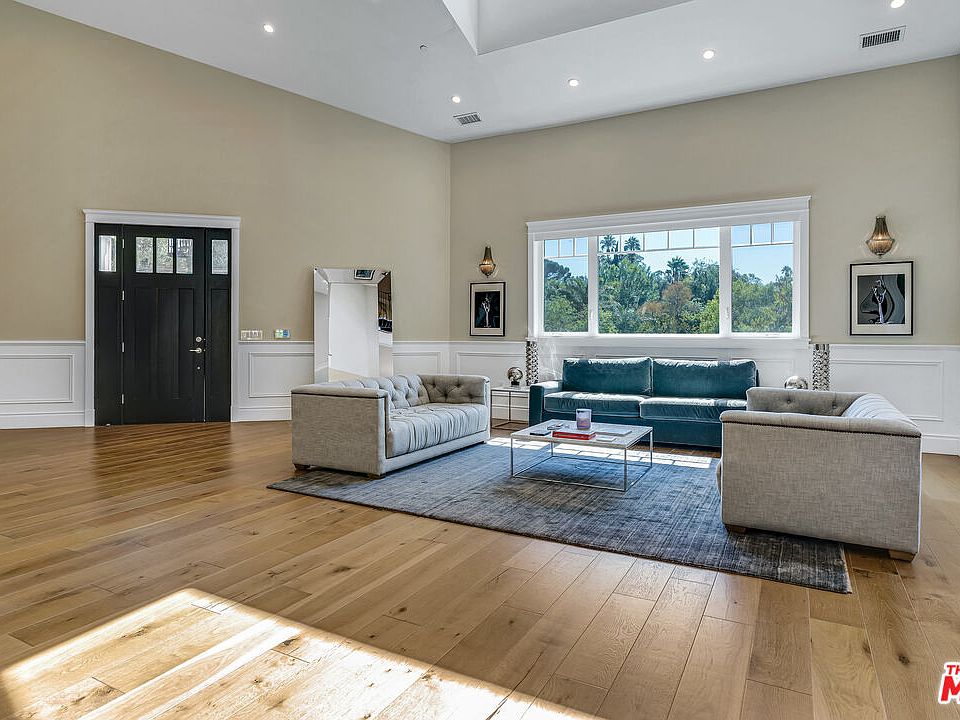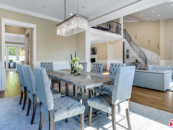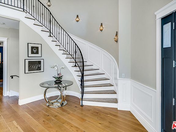 Elegant East Coast inspired gated residence in Tarzana, built in 2014, situated on an expansive 18,000+ sq ft lot. This designer-perfect home showcases quality craftsmanship throughout, featuring brushed white oak flooring, recessed lighting, Restoration Hardware wall sconces, and custom details. Offering 5 bedrooms (one currently used as an executive office/library) and 4.5 baths, the residence blends comfort with sophistication. The open chef's kitchen is designed for both daily living and entertaining, with quartz countertops, a large granite-topped island, top-of-the-line stainless steel appliances including a 6-burner range with pasta faucet, and a butler's pantry. Adjacent to the kitchen is an oversized formal dining room and a spacious living room highlighted by a dramatic two-story ceiling. The main level also includes a guest bedroom suite. Upstairs, a versatile sitting area offers hillside views, along with a convenient laundry room with sink. Two additional en-suite bedrooms complement the elegant primary suite, which boasts dual walk-in closets and a spa-inspired bath with a freestanding Midocean soaking tub, walk-in shower, dual vanities, and makeup counter. The large family room seamlessly connects to a resort-style backyard with a remote-controlled saltwater pool and spa, built-in BBQ island, fire pit, and expansive patio ideal for outdoor entertaining. Additional highlights include a two-car garage with space for a third vehicle, custom window coverings, dual-zoned HVAC, energy-efficient double-panned windows, LED lighting, and a security system with cameras. Conveniently located near The Village, Ventura Boulevard dining and shopping, Warner Center, local parks, and freeway access.