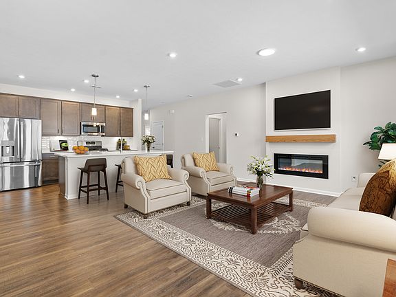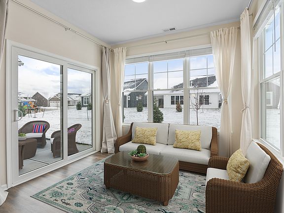 All Upgrades Offered + Pristine Condition + Turn Key New Construction = Perfection. This home is barely lived in by 6 months only, and has all upgrades offered, and owner has already done all of the post-closing new construction projects for you (window coverings & water softener installed). Wow! This home will be a pride and joy for a new owner - an open floorplan with a smart layout - Relax by the fireplace in large living room with with a wall of windows and Sunroom. Spend time in the separate flex/office/gym/second living room space (with doors); Kitchen with large island, beautiful tiled backsplash, under cabinet lighting, walk in pantry and many cabinets. Primary Bedroom is spacious; Primary Bath features dual sinks, fully tiled walk in shower w/ bench, large walk in closet, water closet. Home is low-maintenance (HOA cares for lawn irrigation, mowing & snow). Neighborhood Amenities include: Approx 4mi Private Paved Walk/Bike Trails/Ponds/Covered Shed on Pond w/Outdoor Kitchen & Gas Firepit. Builder floorplan is Adiago. This home is an absolute win for its next owner. Welcome Home!