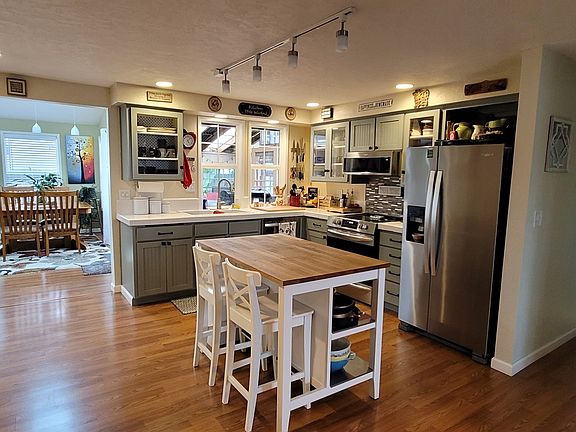 - Features: Builtin Range, Island, Microwave, Free Standing Refrigerator, Laminate Flooring