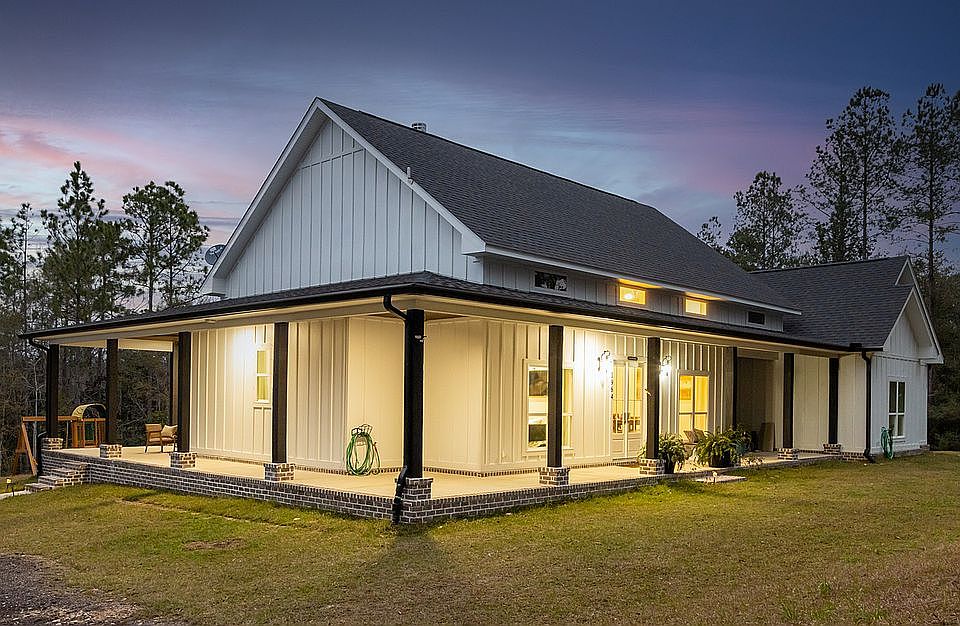 Welcome home to your Custom Farmhouse in the highly desired area of Buffalo Creek. Privately situated in the middle of a 10-acre lot this home has everything your dream home is made of. Starting with the 1500 square foot wrap around porch finished with tongue and groove wood ceiling and stained finish, this porch gives entry to the 8-foot double front door. Upon entry you will be stunned by 15-foot foyer/dining room and 20-foot living room and kitchen vault. The living room comes complete with an amazing floor to ceiling wood burning brick fireplace. The 2 double back doors give access to the wrap around porch and living room views to the gorgeous pines and magnolias. This 3 bedroom and 2.5 bathroom home has endless amounts of storage space from the 20’x 7’5” laundry room to the oversized closets in each bedroom. The His and Her's master bathroom has a cast iron claw foot tub and custom-built rain shower with a Master closet big enough to share. This custom home was built and designed by the current owners in 2020-2021, all features from the waterproof luxury vinyl plank, solid wood cabinets, and quartzite counters throughout were installed to make this home age timelessly. Washer and dryer will remain with the home. Although the home is for-sale by owner, owners are opening to paying a buyer's agent a set commission. Pre-approval required to schedule a showing, showing will be scheduled after 5:30PM and weekends. Come see you forever home and private hunting land.