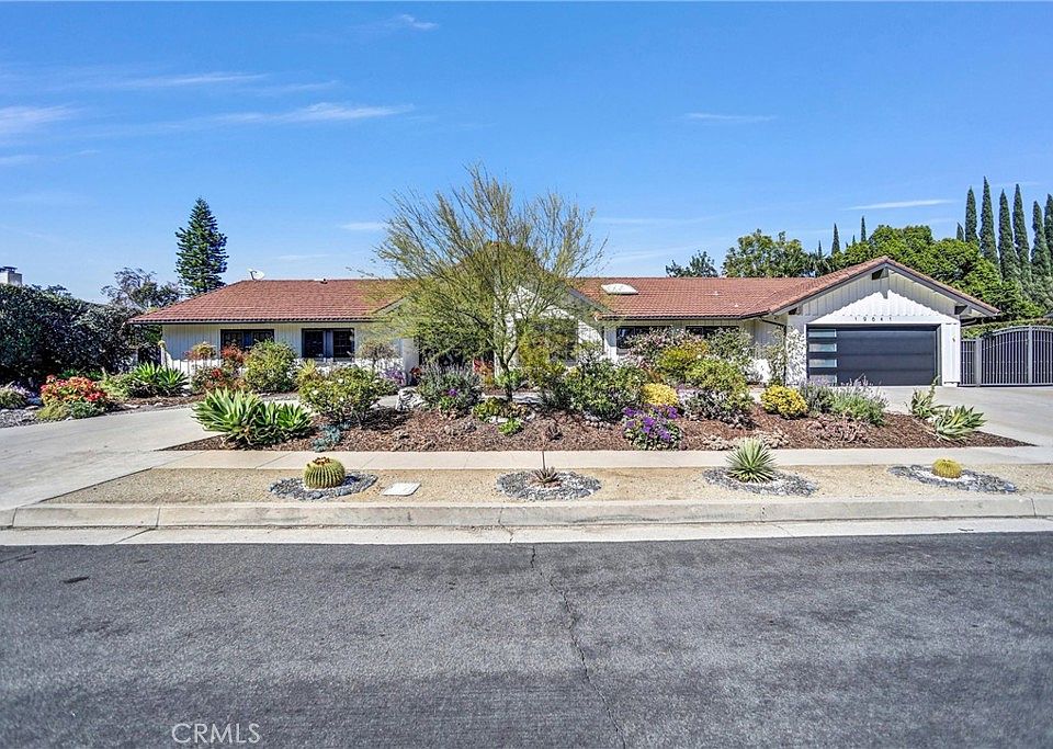 Lush landscaping — complete with mature fruit trees, a veggie garden, a privacy hedge of ficus