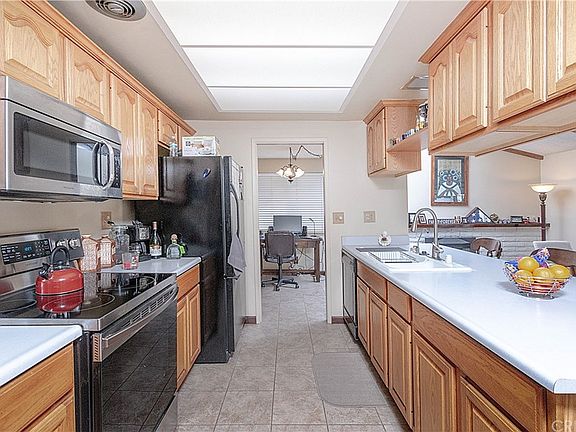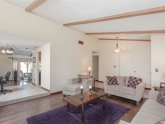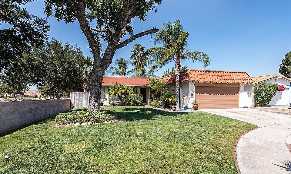 Stunning hillside views will welcome you to this beautiful single story residence offering a desirable cul-de-sac location, lush manicured lawns, a spacious front yard with mature trees, and a cozy rear yard that is begs for summer bar-b-ques and gathering with friends and family. The tiled entry steps down to a warm and inviting living room featuring high vaulted wood-beam ceilings, gleaming laminated wood flooring, base moulding and front yard views. The Kitchen offers ample counter tops space for any cooking enthusiast, with lots of overhead storage options, and built-in appliances that include a dishwasher, microwave, and stove. The secondary bedrooms offer wall-to-wall carpeting siding wall closets, an warm natural light. The master bedroom comes with a large walk-in closet, private 3/4 bathroom with a long vanity sink and shower stall enclosure. The rear yard features a large covered patio area with partial hardscaping, mature gardens and shade trees, a bonus storage shed, and room to grow.