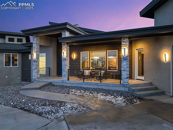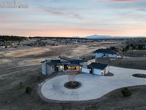 Welcome to this custom-built walkout estate, where luxury and craftsmanship blend with breathtaking natural surroundings. Sitting on the 4th hole of Kings Deer Golf Course, this home offers an unparalleled living experience with thoughtful design, high-end finishes, and exceptional amenities. The heart of the home is a gourmet kitchen with Jenn-Air appliances and custom wood cabinetry. Granite counters and custom lighting make it functional and beautiful. The space also includes a butler’s pantry with granite countertops, a large pantry, and access to the “Babe Cave,” a custom sunroom with wood-burning fireplace and access to a large covered deck with gas outdoor kitchen. The open-concept plan highlights a formal dining room and a large living room with a custom Davinci fireplace and stunning Pikes Peak views! The luxurious primary suite is a private retreat with an expansive walk-in closet with custom drawers, a built-in dresser, and washer and dryer. The en-suite bath offers a spa-like feel with a soaking tub, pond views, and a massive walk-in shower. Also on the main level is a custom office (convertible to a bedroom) and a large mudroom with access to the 5-car garage, which has a drive-through option for camper or boat storage, paired with a circular driveway. The lower level is designed for entertainment and relaxation. It features a spacious recreation area with a 30-ft basketball court, pickleball nets, a climbing wall, and a mirrored workout area. The walkout family room offers breathtaking views and a wet bar, half bath with urinal, and display case. The lower level also has three bedrooms, two sharing a shower/urinal area and each with separate sinks, while the third has a custom en-suite bath. All bedrooms have walk-in closets. With impeccable craftsmanship, modern conveniences, and exceptional outdoor spaces, this estate is a rare opportunity to own a true architectural masterpiece.