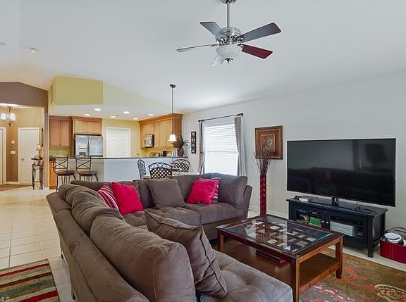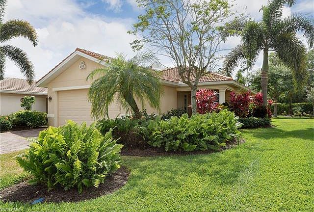 A covered porch entry opens to a foyer that provides an immediate vista through the home to the lovely backyard landscaped views. At the heart of the home, the gourmet kitchen with beautiful granite countertops, upgraded cabinets, and spacious pantry connects seamlessly with the dining and great rooms for gracious, easy flow and comfortable living. High vaulted ceilings add to the sense of light complemented by neutral tile in the main living areas. The master bedroom features a coffered ceiling, large walk-in closet, and a well-appointed private bathroom with a whirlpool tub. The two spacious guest bedrooms share an attractive bathroom with upgraded cabinetry. At the rear, a screened lanai provides the ideal spot to enjoy a relaxing sunset cocktail. Other features include a separate laundry room, two-car garage, and natural gas. Located west of I-75, this Toll Brothers community offers many amenities including a clubhouse with fitness and billiards, a resort pool, tennis, bocce ball, and basketball.