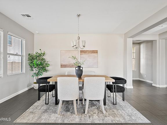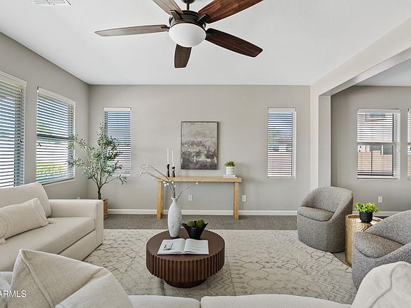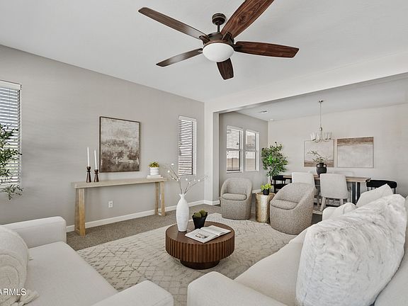 Immaculate single-story, 2,369 sq. ft. home in Blue Horizons, Buckeye! Built in 2016, this 4 bed, 3 bath home sits on a huge 12,137 sq. ft. corner lot (over ¼ acre) with no homes behind and beautiful mountain views. Enjoy new interior & exterior paint, new carpet, and an open kitchen with island, pull-out shelves, and all appliances included. Features an integrated guest suite with bedroom, bath, sitting area, and walk-in closet. 24 PAID solar panels with warranty, Nest thermostats, Ring doorbell, and security cameras included. Custom exterior lighting package lets you change colors for any occasion. 3-car tandem garage with built-in storage and cable outlets in every bedroom, living room, and den. Move-in ready—true pride of ownership!