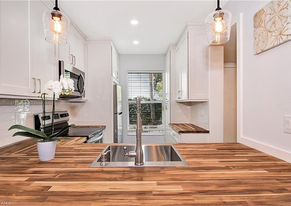 1ST FLOOR FULLY REMODELED END UNIT! Just completed and never lived in before. This light and bright 3 bedroom 2 bath condo is sure to impress. From the moment you walk in the kitchen you will notice the brand-new white shaker cabinetry with crown molding and 12-inch overhang butcher block countertops. Stainless steel appliances, matching sink and hardware with new disposal and gooseneck faucet, subway tile backsplash, and undercounter lighting. All new light fixtures, recess cans, and fans throughout. New paint from floor to ceiling, including woodwork and doors. Six-inch vinyl oak flooring with extra moisture barrier underneath and finished with 6 inch flat stock square baseboards. New bifold doors on closets. Large primary bedroom with huge walk-in closet and custom glass shower enclosure. Third bedroom boasts tongue and grooved ceiling and wall details and custom bypass closet doors. Enjoy your evenings in the screened-in private patio. Unit is a must see as no expense was spared for this remodel. Close to shopping, dining, and Publix all with a 3-minute walking distance. World class 5th Avenue shopping and beaches nearby with just a ten-minute drive.