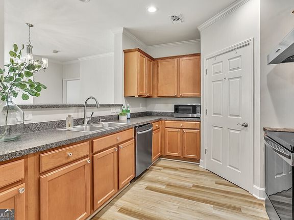 Sophisticated Condo Living in the Heart of Alpharetta ? Step into this move-in-ready home where style meets convenience. Thoughtfully upgraded with a new HVAC and water heater, luxury vinyl plank flooring throughout, and a new kitchen hood, a rare feature in condo living. Smart home touches, including a surround sound system, smart thermostat, and smart lock, make everyday living effortless. The split-bedroom layout ensures privacy, with each suite featuring a walk-in closet. The primary retreat shines with double vanities, a soaking tub, and separate shower, along with added armoires for extra storage. The open-concept kitchen and living space is perfect for entertaining, while your private balcony offers a quiet place to unwind. Located on the first floor of a secured building, convenience is key with your assigned parking spot just steps away. Community perks abound-gazebo, pet area, green space, and swimming pool access right across the street. All this, and you're moments from Avalon, North Point Mall, Top Golf, Ameris Bank Amphitheater, and the vibrant downtowns of Alpharetta and Roswell, with easy access to GA-400.