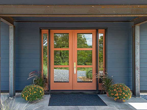 The interior finishes are inspired by the colors and textures of the land: warm white oak flooring, a calming blue-green palette in the primary suite, and elegant cabinetry in tones of sapphire blue and mushroom. Playful, unexpected details, a dandelion-inspired chandelier, a wasabi-colored laundry room, and industrial steel exterior supports all add character and charm.