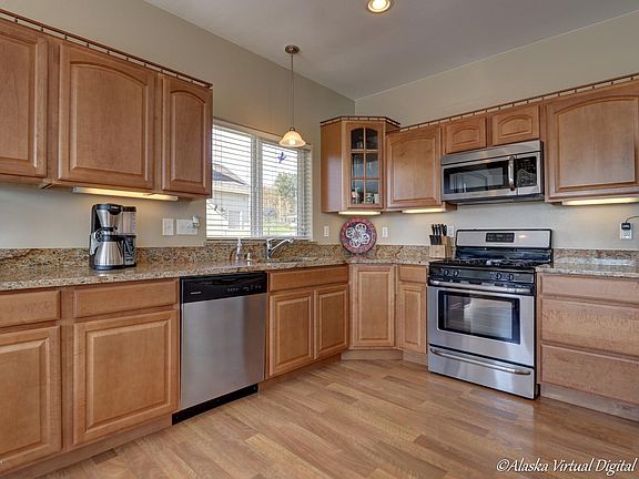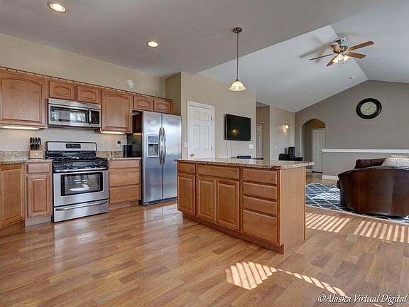 Well cared for hillside Ranch-style home with daylight basement. Spacious 4 bedroom, 3 bath home with 2 living areas, den/office, and wet bar for entertaining or mother in law potential! Open floor plan with gorgeous mountain views, granite counter-tops, stainless steel appliances, master en suite with jacuzzi tub. Huge back deck, oversize 2-car heated garage, RV parking, and security system. Additional gravel parking pad extends to backyard shed that fits yard tools & a 4-seater side by side comfortably. Built-in fire pit. Best location in the Valley for commuters! Home is located in the highly desirable Ranch subdivision off the new South Trunk Road extension and offers a State protected wildlife preserve, Chuqilintnu Wasilla Trailhead boardwalk, bike path, its own elementary school, and more!!! Current HSA Home Warranty to be transferred to Buyer, expires January 07, 2019. If desired, downstairs bar shall remain with property.