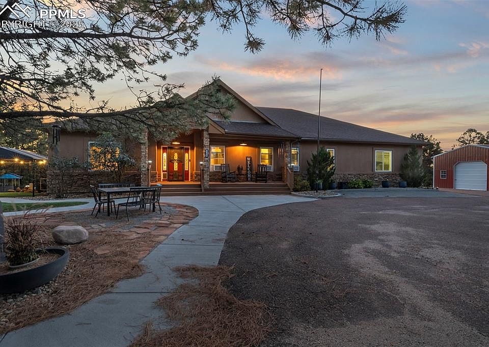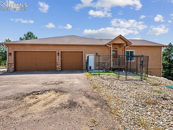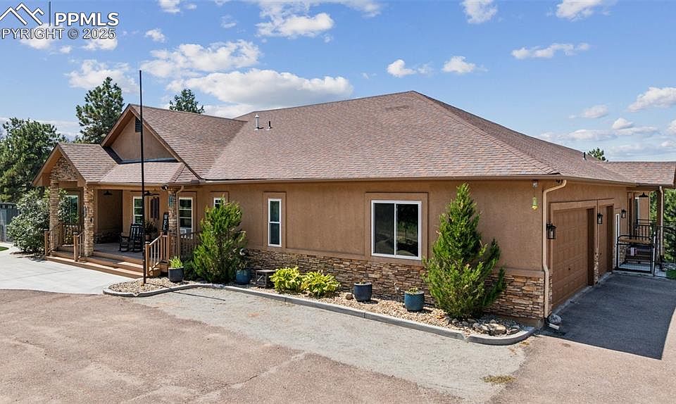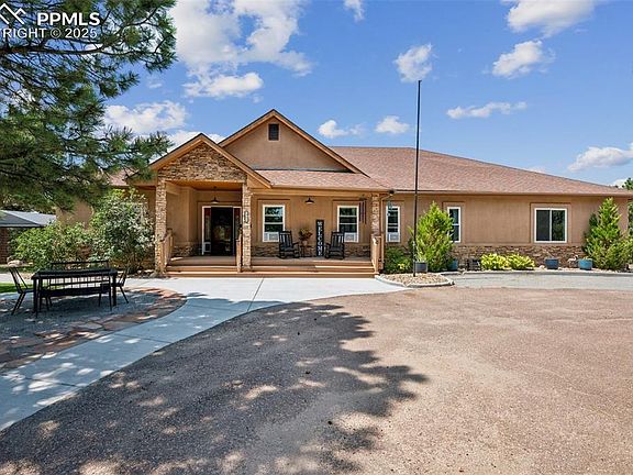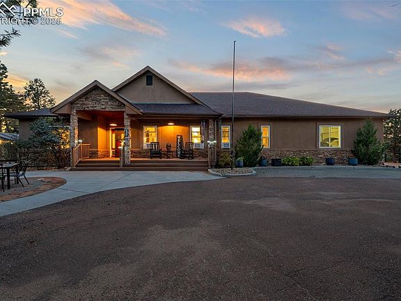 Welcome to the Saddle Blanket Ranch!! This 7,000+ square foot multi-generational home sits on 35 beautifully treed acres and features 8 bedrooms, 4 baths and garage space for 9 cars as well as a fully functioning mother in law suite with full kitchen, full bath and laundry space! This beautiful home has 2 wood burning fireplaces and energy efficient radiant heating throughout. The open concept main level kitchen features GE Cafe appliances, gold hardware, professional ice maker, breakfast bar, prep sink and a large pantry. The great room has a wood burning fireplace with custom surround and wide plank luxury vinyl flooring. The HUGE 532sf deck boasts tranquil forest views with Pikes Peak as the focal backdrop! imagine having your morning coffee or evening beverage watching the sunset here, absolutely stunning! The Primary suite is its own retreat with attached 5 piece bath, soaking tub and walk in shower, fireplace and walkout to the oversized deck. There are 3 full kitchens and 3 laundry spaces throughout the home, including a full kitchen and laundry space on the lower level. Main level laundry includes built in cabinets for extra storage and a sink. there is a secondary ensuite on the main level with attached full bath, and 2 additional bedrooms, an office and a mudroom. The walkout basement features 3 additional bedrooms, a HUGE family room, media room, home gym w/ attached laundry space, full kitchen, full bath and bonus storage areas. Pool table and foosball table are included! Cabinets in the office, basement and garage create extra storage space and stay with the home. Outside you'll find 2 versatile 25'x45' metal utility building that are perfect for storing extra vehicles and toys. Rv parking on site. Whole house water filtration, reverse osmosis system, Starlink installed and fiber optic for high speed internet. Beautiful custom upgrades throughout! 35+ acres of lush forest, 3 Greenhouse and a cute chicken coop make this a homesteader's delight!