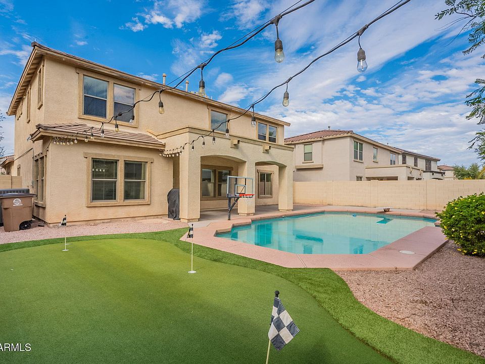 This beautifully updated home is move-in ready and offers plenty of space both inside and out. Enjoy newer laminate wood flooring downstairs and in all bathrooms. The open layout includes a spacious living room, dining area, and a large kitchen that's perfect for entertaining. A full bedroom and bathroom downstairs provide flexibility for guests or multigenerational living. Upstairs, you'll find a generous primary suite with an oversized walk-in closet, plus a master bath featuring a separate shower and soaking tub. Step outside to a backyard designed for relaxation with a sparkling pool, recently updated pool equipment, and a large covered patio, ideal for Arizona living! Located just minutes from Queen Creek Marketplace, shopping, dining, and entertainment are right at your fingertips