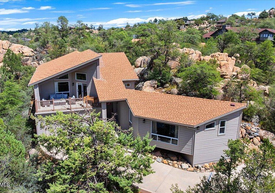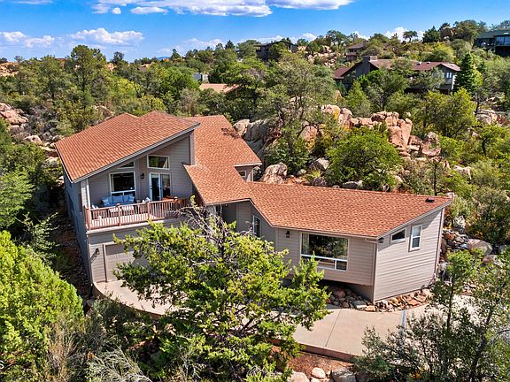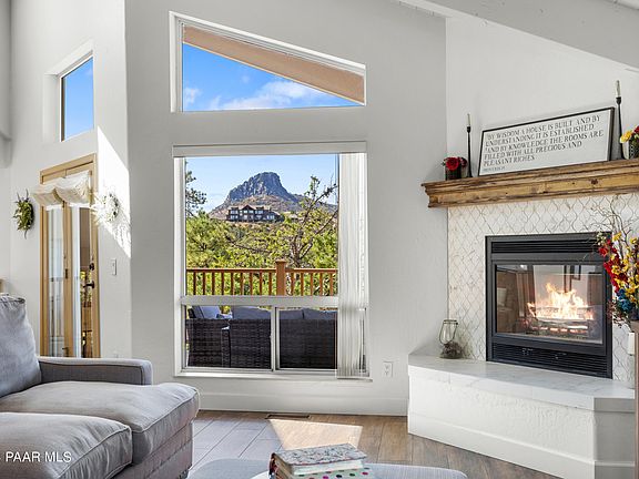 This custom home was built with every view in mind! Granite Mountain and Thumb Butte have never looked so good from this beautiful 3-bedroom, 3-bathroom home nestled in the sought-after Forest Trails subdivision of Prescott. Thoughtfully designed by a local architect, the home captures the area's stunning scenery with expansive windows that fill the space with natural light.Inside, charming tongue and groove ceilings create a warm, inviting atmosphere. The spacious kitchen is an open culinary haven, complete with a new double oven, generous counter space, and abundant storage--ideal for hosting or everyday cooking. The bathrooms have been recently updated with sleek, modern fixtures and finishes, providing a clean, contemporary look. Additional recent upgrades include a new water softener, a whole-house water purification system, and brand-new RunTru by Trane air conditioning and furnace units.This home offers exceptional outdoor living, with multiple decks that blend seamlessly into the surrounding boulders and trees, showcasing breathtaking mountain and forest views. If you're seeking a property that feels peaceful and secluded yet remains just minutes from town, this is the perfect choice. Make it yours!