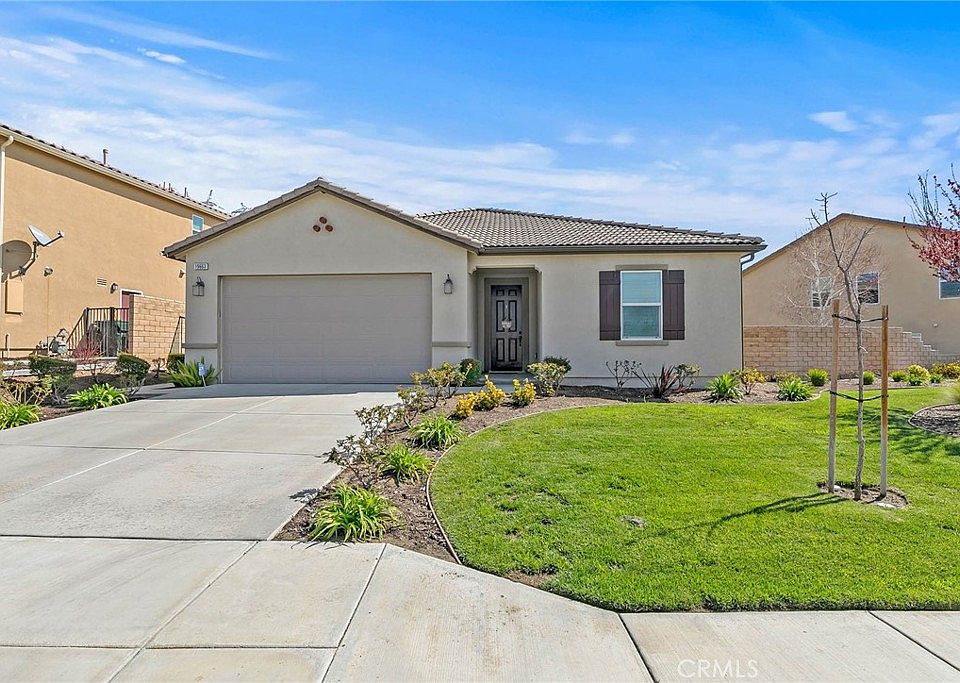 Gorgeous Single Story Home. Beautiful floors with ease of tile, but the look of planked wood leads you from the entry to the Great Room. This open concept makes it easy to entertain and enjoy family time. Plus, an additional sectioned-off area can be a formal dining room, den, or office. The stunning kitchen features a large island with beautiful cabinets, stainless steel appliances, and a walk-in pantry. This meticulously maintained home, with warm, natural light and easy living, features a spacious primary bedroom with a walk-in closet, an en-suite bathroom with a walk-in shower, a separate soaking tub, and dual sinks. The secondary bedrooms are a great size. Some additional upgraded features of this home are ceiling fans in all three bedrooms, the office, and the living area. Sputnik chandelier in the dining area. The carpeting is new with high-grade extra padding. All the doors, baseboards, ceiling, and trim are painted with Sherwin-Williams pure white and repose grey for the walls. You will love the beautiful front yard landscaping with a sprinkler system on a timer. The backyard has a patio cover, a large side yard, an above-ground swim spa that features a swim-in-place treadmill, and resistance bands with multiple modes of resistance. The spa has lights that change the color of the water for fun! Sun Run Solar panels to help keep the energy bills down.
