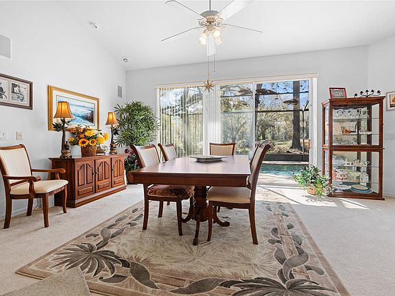 Come see this fully furnished pool home with Rainbow River Access, situated on a peaceful 1/2 (approximate) acre lot. New roof, freshly pained with 2249 SF of living space, this 3-bedroom, 2-bathroom and a over-sized three car garage home offers a comfortable and spacious experience. Relax and unwind on the screened lanai featuring, ceiling fans, built in speakers, Tinted vinyl opening windows on the north side of lanai, and gas heated inground pool and hot tub that has a fountain over flowing into the pool, the perfect spot to end your day after enjoying the beautiful amenities of this incredible community. Bring the outside in by fully opening the Thirty two feet of sliding glass doors in the dinning room and the family room There is an irrigation for mature landscaping with your own well. You will love the open floor plan with living room, dining room, plus a flex room/office. Home is handicap accessible. One of the standout features of this area is the private "beach" and kayak launch, providing convenient access to the breathtaking Rainbow River. Indulge in the community's offerings such as a delightful pool, tennis courts, and even an unused golf course on fairway 16 , which presents a great opportunity for disc golf or tranquil nature walks. Maintained and mowed POA. Seeking even more entertainment. The recreation center offers pool tables, craft rooms, exercise facilities, and meeting spaces. Within the community, you'll also discover a fantastic dining option known for its food and vibrant atmosphere. Unwind with weekly outdoor entertainment, available for both community members and the public. Centrally located near Rainbow Springs State Park, this community provides easy access to shopping, groceries, downtown Dunnellon restaurants, and various local amenities. Additional features include: New Ac Condenser unit coils, New hot water heater, dishwasher and refrigerator, Build in speakers, Ceiling fans throughout home including mater bath. Schedule your tour today. Bedroom Closet Type: Walk-in Closet (Primary Bedroom).