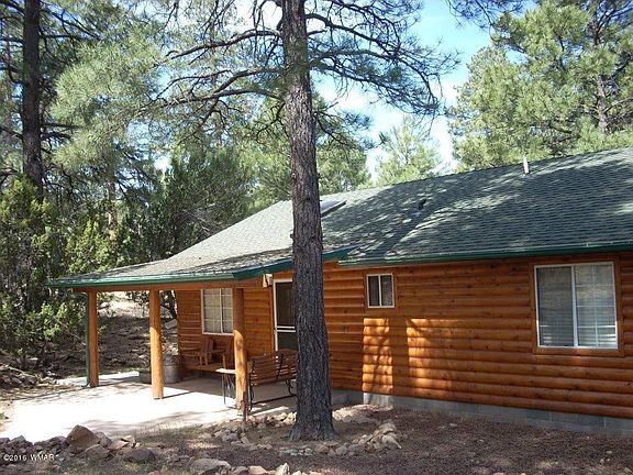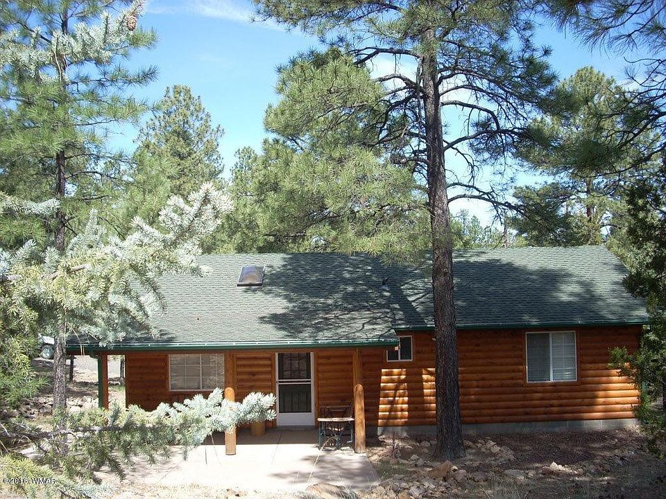 Charming 2 bedroom, 2 bath log sided cabin is tucked among the old growth Ponderosa Pines on a .41 acre lot. If you're looking for a great summer getaway or full time living, this cabin has been well maintained with vaulted ceiling, dual pane windows, central propane heat and is light n bright with skylights too! Front & rear covered patio has t&g ceiling plus shed has electric. Easy paved access with private feel.