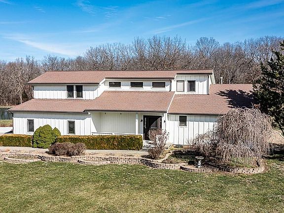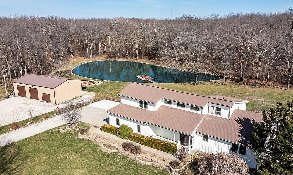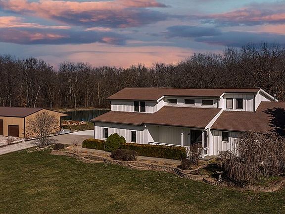 EXQUISITE 4-BEDROOM ESTATE HOME ON 5 TRANQUIL ACRES WITH POND VIEWS! Indulge in the charm of this private 1.5-story retreat, featuring granite counters in the kitchen, and elegant hardwood floors throughout. The living room is bathed in natural light, courtesy of vaulted ceilings and skylights, creating a warm and inviting ambiance. The second-story master suite opens to an outside deck, offering breathtaking views of the stocked pond, embraced by limestone boulders and picturesque woods. Cozy up by the wood stove, enjoy the spacious screened-in porch, or entertain in the finished basement equipped with a family room, exercise area, and a fire pit by the pond. Additionally, the property includes a 30x48 shop with concrete floors, insulation, and three garage doors. This home seamlessly combines luxury, privacy, and natural beauty.