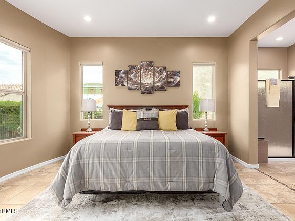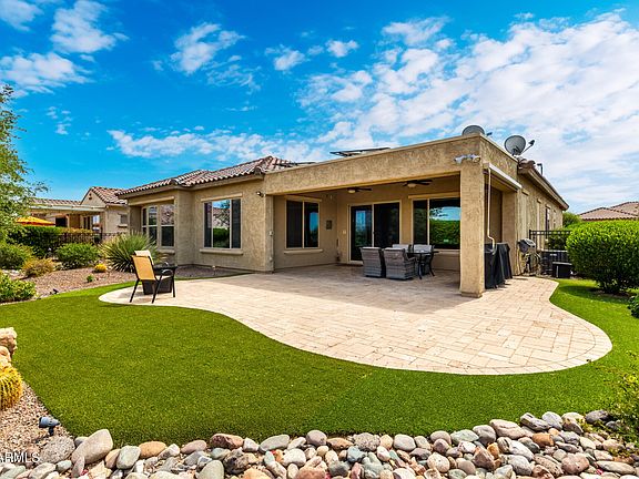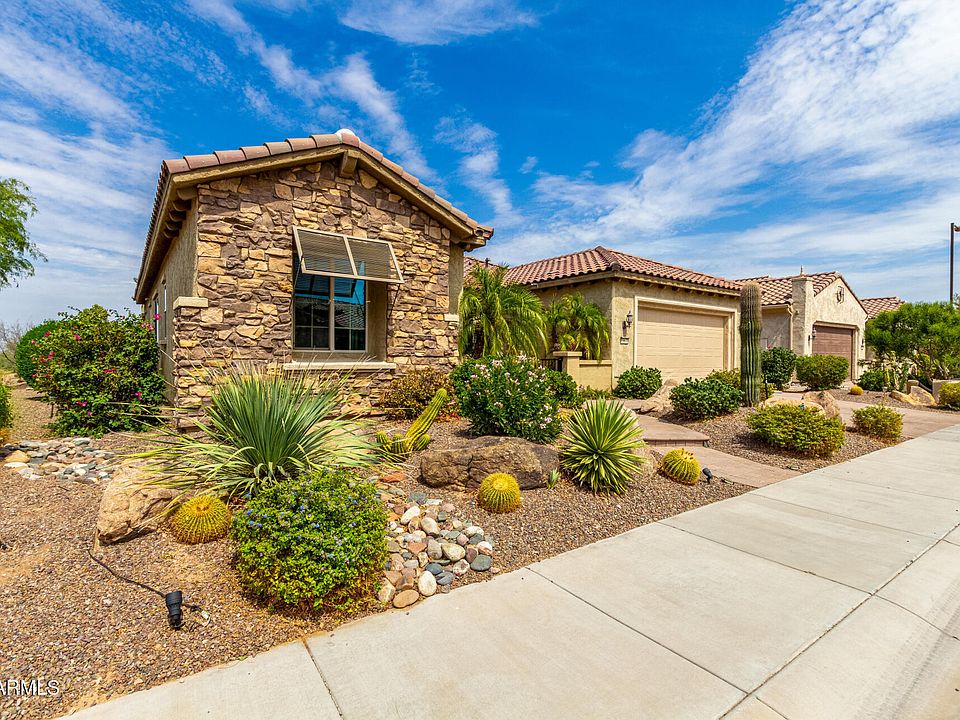 Your perfect winter escape or refined year-round retreat awaits in Sun City Festival (55+). Set on the 2nd tee, this 2,337-sq-ft home captures straight down the fairway views and west facing mountain sunsets from a tee-box position where shots launch downrange. Inside, fresh upgrades shine: granite counters, elevated cabinetry, upgraded tile flooring, and new paint. Flexible plan with 2 bedrooms, 2 baths, a dedicated office, and a large bonus room for media, dining, or a future third bedroom. Home solar helps keep electric costs low. 3-car tandem garage with built-ins, low-care yard, covered patio, and resort amenities, clubs, and golf.