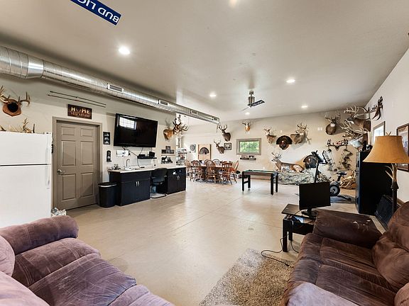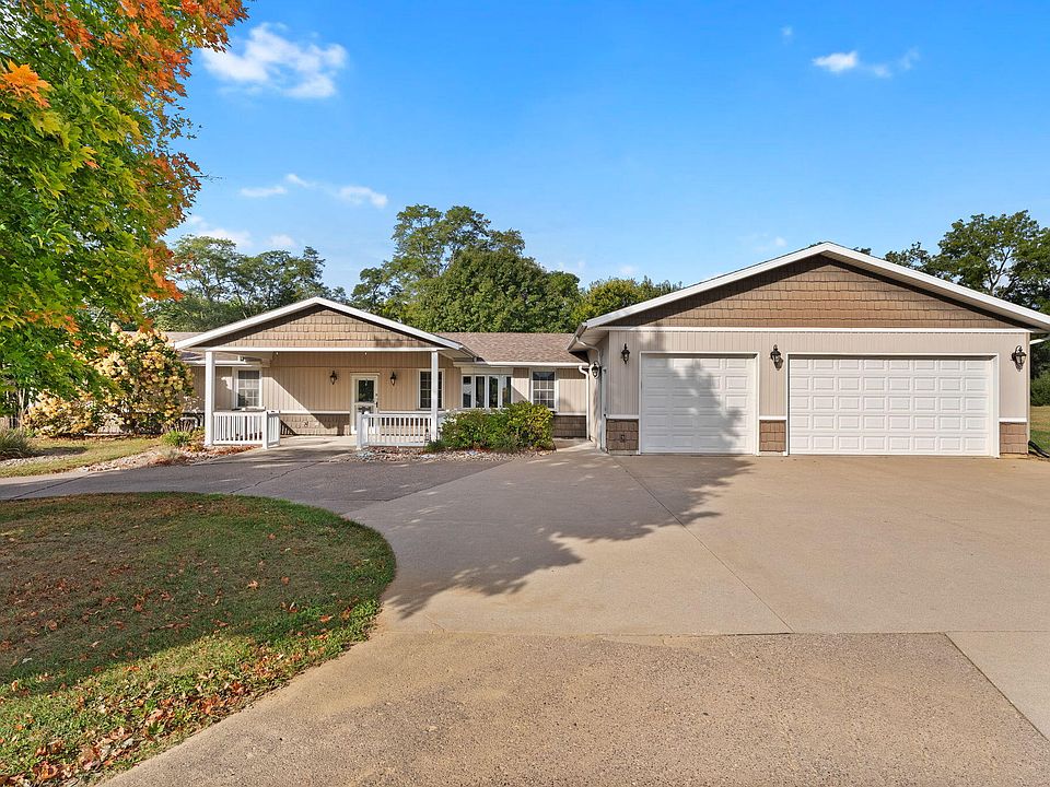 This is a fantastic ranch home on 2 acres with the garage of your dreams! The attached garage is 1800 finished sq ft, has in-floor heating and Central Air, a kitchenette / bar, a 3/4 bath, and a glass garage door that opens to a patio and large deck area that includes a swimming pool, making this a great home for entertaining. The back yard is private and backs up to woods. Inside you'll find an open concept layout, with wood flooring, granite counters, a kitchen island, and a dining area with large windows. Convenient main floor laundry. The primary bedroom has access to the deck, crown molding, a large tile shower and jetted tub. The lower level is a walk-out, with a kitchenette with wine cooler, family room, 3/4 bath, office area and stone fireplace. Quiet setting on hard surface road.