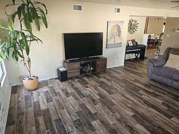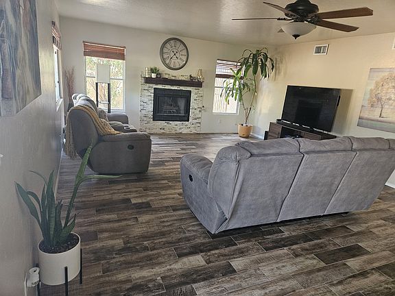 Outdoor living shines with double flagstone patios, a rainbow playset, brand new pool heater, and a large brick-paver basketball half court ideal for recreation and relaxation. The wash area behind the home provides extra privacy and scenic desert views.
