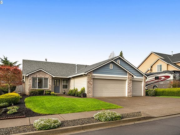 Welcome to your Oregon City dream! Nestled in the desirable Noble Ridge neighborhood, this charming single-level three bedroom, two bathroom home is a true gem, offering both comfort and style. Step inside and be greeted by soaring vaulted ceilings that create an open, airy feel. The freshly painted interior and updated lighting add a bright and contemporary touch. At the heart of the home, the spacious kitchen boasts a large peninsula with bar seating, stainless appliances and plenty of prep space—perfect for hosting gatherings or enjoying casual meals. A sliding glass door leads to the beautifully landscaped backyard, where a lush, private oasis awaits, complete with an in-ground sprinkler system to keep it vibrant year-round. The elegant three-sided gas fireplace is a showstopper, providing warmth and ambiance as it seamlessly connects the dining and family rooms, making both spaces feel cozy yet grand. The thoughtful layout includes a dedicated laundry room and a rare 3-car attached garage, offering ample storage and convenience. Beyond the home’s stunning interior, its location is unbeatable—just minutes from the neighborhood elementary school and a variety of local amenities. Whether you’re looking for a peaceful retreat or a space to entertain, this home has it all.