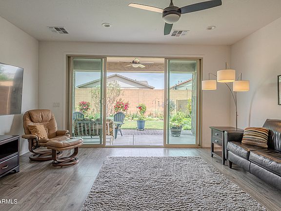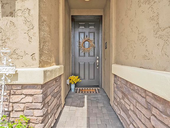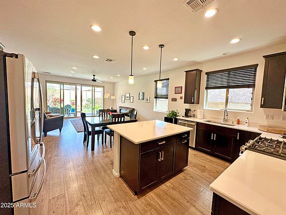 Welcome to Village Grove in Verrado. This four-bedroom, two-bath home offers a seamless flow that is perfect for today's lifestyle. The chef's delight kitchen features a large island with seating, stainless GE Profile appliances, 42-inch upper cabinets with crown molding, white quartz countertops, and a walk-in pantry. From the main living area, you are drawn outdoors to a covered patio extending your living space outdoors. Additional pavers across the width of the backyard create an inviting outdoor oasis, complete with lush landscaping that adds tranquility and beauty to your home. The backyard is designed for ultimate relaxation and entertainment, featuring ample space to unwind and a Pit Boss Grill perfect for preparing meals under the desert sky. The primary bedroom suite offers a peaceful retreat with an en-suite bath, double sinks, and a large walk-in closet. The additional three bedrooms are split from the primary suite, ensuring privacy and comfort for everyone. this home is mere steps from two community parks. Verrado is known for multiple parks for all residents to enjoy. Among the other numerous amenities in Verrado are the community center with gym, classes and events, two pools, golf courses. One year Home Warranty is included for the new owners. Additional features of this home: Kenmore Elite Washer and Dryer, five metal shelving units in the garage for your storage needs, backyard shed, patio table and chairs, and an electric mower to keep your oasis looking pristine. Don't miss out on this exceptional home!