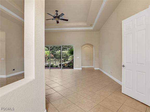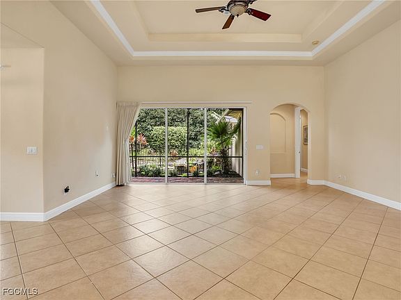 Distinctive Toll Brothers residence in Belle Lago with a custom-designed backyard unlike any other. One-story home with two bedrooms plus optional third/office, two baths, and a two-car garage. Tray ceilings, crown moulding, 8-ft doors, plantation shutters, and large beige tile throughout. A panoramic multi-tier waterfall flows beside the main rooms and screened lanai into a pond, viewable from multiple interior angles. Natural-gas kitchen with granite counters, stainless appliances, and wraparound breakfast bar. Open great room with 3-panel sliders framing wide pond and waterfall views. Whole-house Generac gas generator (2024) auto-transfer backup for storms. HVAC replaced 2023. Laundry with utility sink, gas dryer, and matching washer. Private guest wing functions like a mother-in-law suite. Owner’s suite has dual step-in closets, a refined bathroom, and views of the pond and rear landscaping. Backyard offers exceptional privacy with dense tropical hedging along sides and rear. Community pool a short stroll away. Belle Lago offers resort amenities in a gated setting near US-41, I-75, Hertz Arena, Gulf Coast Town Center, Miromar Outlets, Coconut Point; beaches ~20 min away.