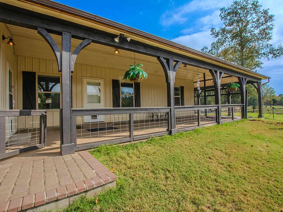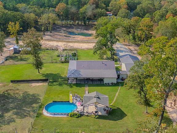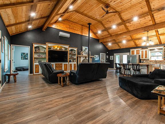 Enjoy country living at its finest on this beautiful 4.6-acre property featuring wrap-around porches, multiple fenced areas, and lush gardens with fruit trees. The grounds include a chicken coop, a relaxing gazebo, and an above-ground pool—perfect for entertaining or unwinding outdoors. With plenty of space to roam and relax, this property offers the ideal blend of comfort, privacy, and rural living. This stunning open-concept living space perfectly blends rustic charm with contemporary design. The room features a breathtaking vaulted wooden ceiling with exposed beams, creating warmth and character that extends throughout the home. The rich wood tones are beautifully complemented by sleek dark accent walls and recessed lighting, giving the space a cozy yet sophisticated atmosphere. The kitchen, seamlessly connected to the living area, showcases a large breakfast bar with seating, stainless steel appliances, and two-tone cabinetry that ties the rustic and modern aesthetics together. Luxury vinyl plank flooring runs throughout, enhancing the room’s open flow and durability. Two large bedrooms can serve as a primary on either side of the home. Potential for 3rd bedroom (sitting room )