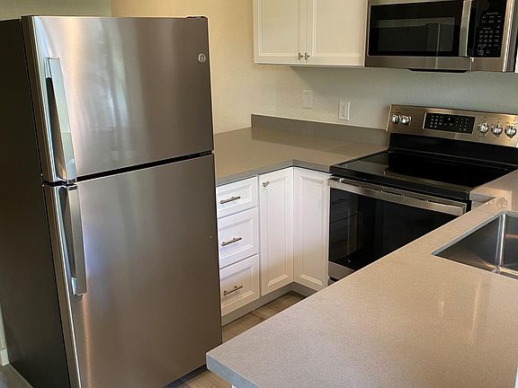 Updated 2 bedroom 1 bath Condo in a gated and secure community close to everything. Brand new kitchen including stainless steel appliance package. Very light and bright with new flooring that warms up the space. Central heat/air conditioner. Washer & dryer in the unit. Large walk in closet in the Primary bedroom. Private full size patio/deck off kitchen. You can enjoy dinner or a cup of coffee and even access the deck from the primary bedroom. Walk to Todos Santos Plaza, close to John Muir Medical, movie theatres etc. Restaurants and Cafe's really close by. Easy access to freeways. This is a beautiful unit; looking for a tenant that will make it their home.