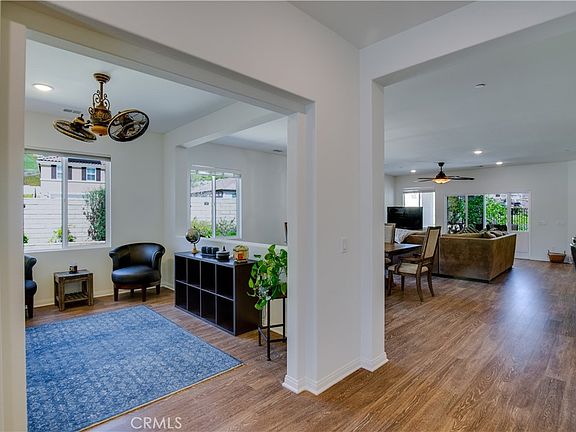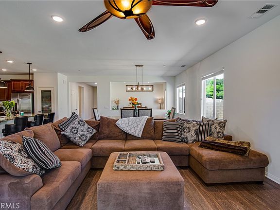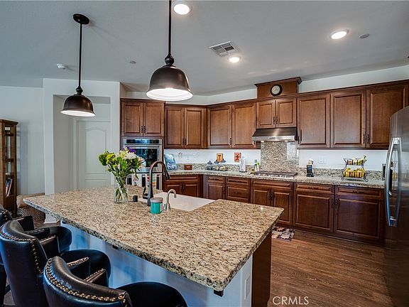 Located within the desirable hillside Plum Canyon community this beautiful single story home boasts an open concept floor plan with 3 bedrooms, 2 baths and a den/bonus room (can be converted to 4th bedroom). Upon arrival, you’ll notice the lovely landscaped corner lot yard with drought tolerant plants and trees and inviting courtyard. The entry leads you to a light and airy great room that creates an inviting atmosphere seamlessly connecting the kitchen, dining and living rooms. The stunning kitchen features a large island with extended upper and lower kitchen cabinets , granite countertops, farmhouse kitchen sink, stainless steel appliances including double oven and 5 burner cooktop with a hood, wine fridge, all KitchenAid appliances and pantry. Enjoy a quick meal at the island breakfast bar or dining area with backyard views. Adjacent to the great room is a flex room suitable for a variety of needs. Just off the entry is the laundry room with upper cabinets and a double door pantry. This meticulously maintained home features a spacious primary bedroom with a walk-in closet, an en-suite bathroom with custom built modern large walk-in shower. The secondary bedrooms are a great size. Interior finishes include luxury vinyl flooring, 9 foot ceilings, tall 8 foot doorways, updated baseboards, OWNED solar panels, tankless water heater located in the completely finished two car garage with it’s own heating and cooling system.The backyard has a nice covered patio area creating a perfect space to enjoy the outdoors and some shade. The yard wraps into the large side yard where you’ll find a beautiful garden area ready for your green thumb. HOA amenities include a sparkling pool, spa, kiddie pool, BBQs, outdoor seating and showers.Just a short drive to Award-winning schools, shopping, restaurants, and the newly built Skyline Ranch Plaza. No Mello Roos! This is the dream home you have been waiting for!