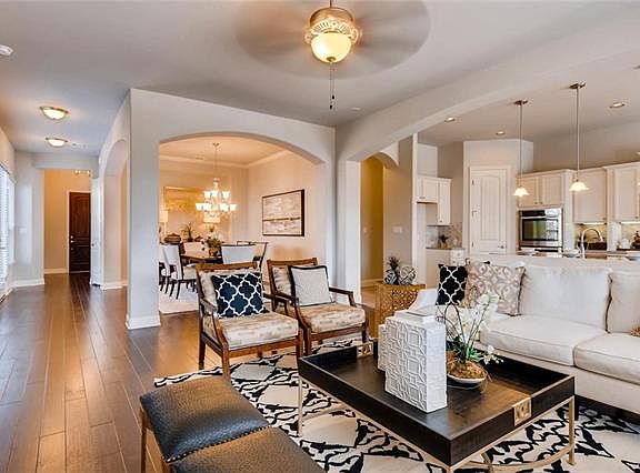 Wide open 1 story layout with unlimited Outdoor entertaining space including large covered back patio and side Courtyard / Deck area plus an extra large backyard! This home features 3 car garage, home office, and an oversized Kitchen with double ovens. Home finishings include wood flooring in the Entry, Family Room and Study, upgraded Newport Spa in Master Bath, and full yard Sprinkler System and Sod. Caliterra is a Natural Gas community. No septic, wells or propane! 250 acres of green space in Caliterra!