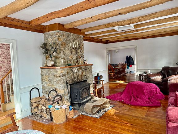 Classic cape farmhouse in Leeds. Situated on 3 wooded acres on a quiet dead end road, this 2,500 sq ft home boasts 4 bedrooms and plenty of charm. The wood floors and exposed beams are just a few qualities of this 1820 house that make it such a unique home. The attached 2-car garage leads right into the enclosed porch with large windows offering lovely views of the neighboring fields. Multiple heating sources offer comfort on even the coldest of Maine winter days. Beautiful gardens surround the house and are on full display in the spring and summer. Make this your dream home today!